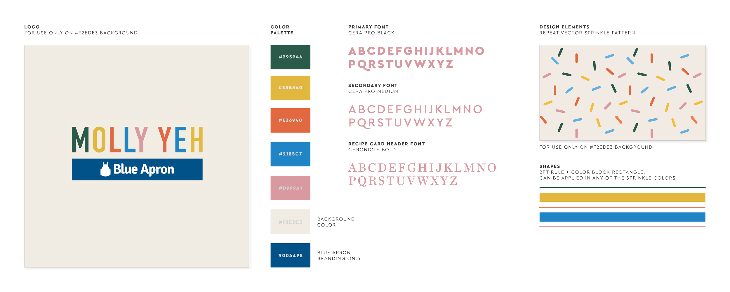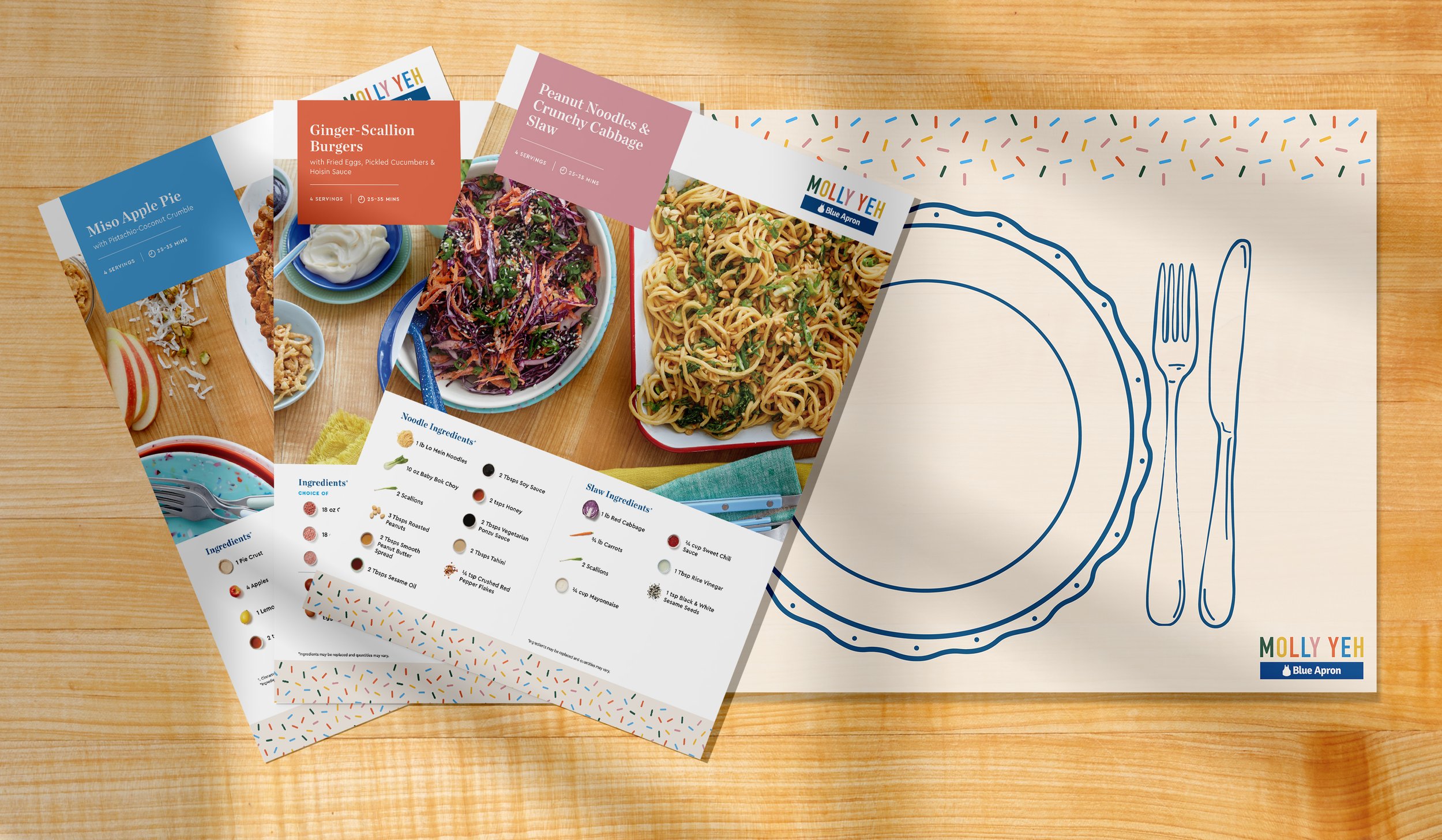 As creative lead, I oversaw the campaign from concept through execution, developing a custom logo lockup and brand guidelines that balanced Blue Apron’s identity with Molly’s playful, colorful style. I directed photography and styling to bring warmth and approachability to the recipes, and led creative across packaging, digital, and social—including a limited-edition booklet with meal tips, branded recipe cards and placemat, landing page, email, paid and affiliate ads, and organic content.